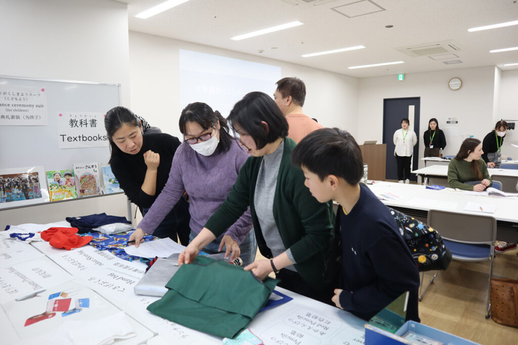 オリエンテーションでは、実際に学校で使用する学用品を見せながら、日本の小学校に関する基礎情報、放課後の過ごし方、入学前に必要な準備物などについての説明を行います。