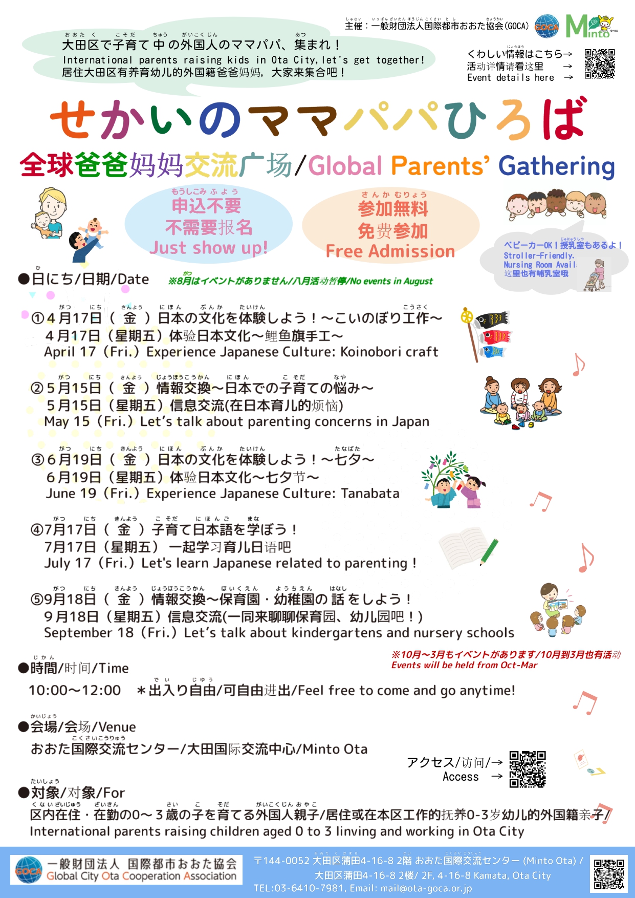 | 日程・内容 | 第1回:2026年4月17日(金曜日) 日本文化~こいのぼり工作~ 第2回:2026年5月15日(金曜日) 情報交換~日本での子育てについて話そう!~ 第3回:2026年6月19日(金曜日) 日本文化~七夕~ 第4回:2026年7月17日(金曜日) 子育て日本語を学ぼう! 第5回:2026年9月18日(金曜日) 情報交換~保育園・幼稚園の入園について話そう!~ ※8月はお休みです。 |