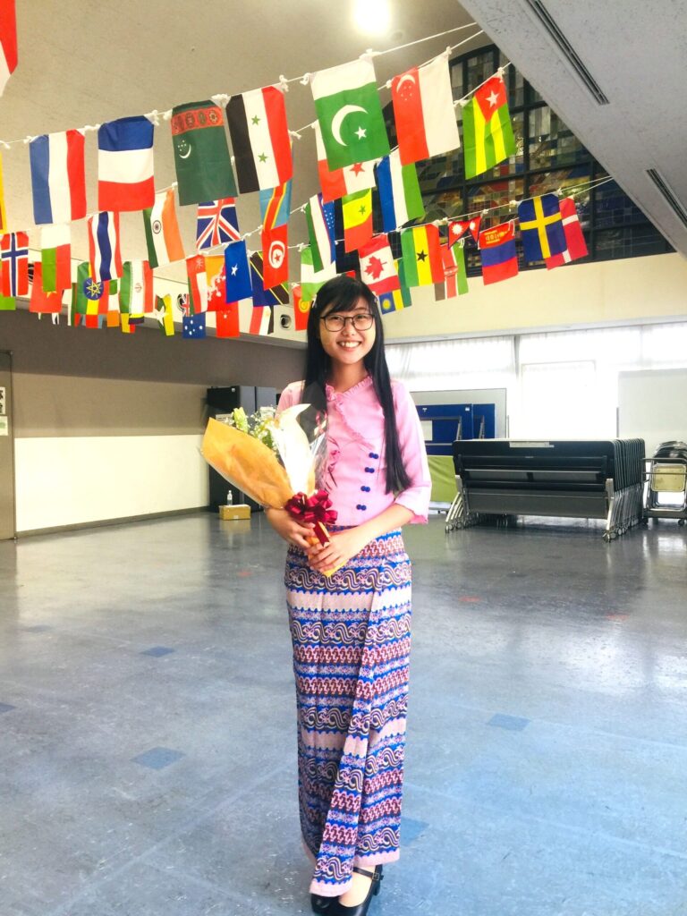 「私は、恵まれたと思います。奨学金制度がなければ、私がどんなに勉強しても日本に来ることができませんでした。今も感謝しています。また、家族にも恵まれました。ミャンマーにいたころ、一日の勉強を終えて、家族と話すのは楽しくて、気分転換になりました。日本に来た時も、親が励ましてくれたおかげで、安心して勉強を続けられました。今も、日々応援してくれています。奨学金の財団の例会があるときには、ミャンマーの服装に、親が送ってくれたものを身に着けて行きます。」