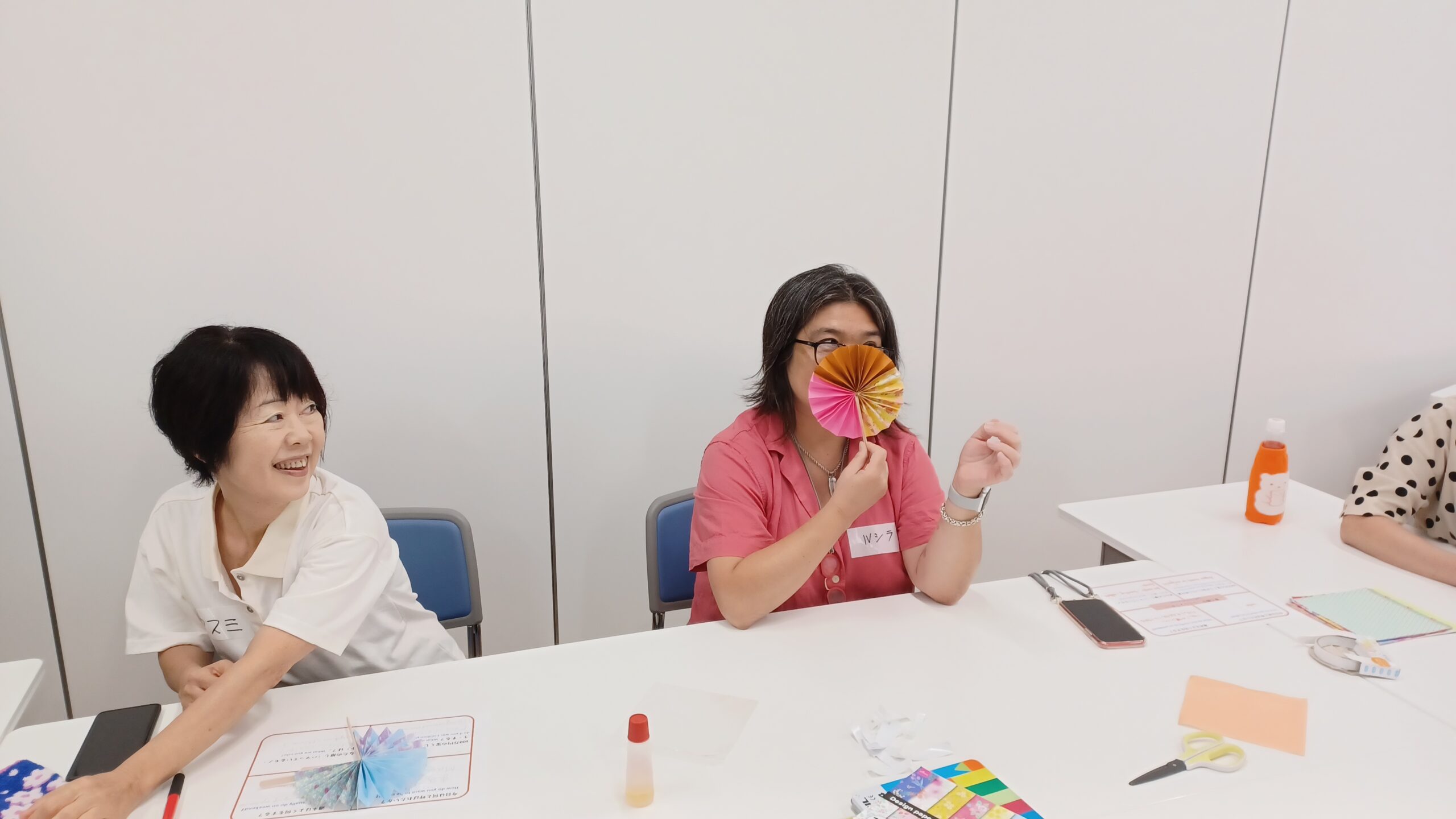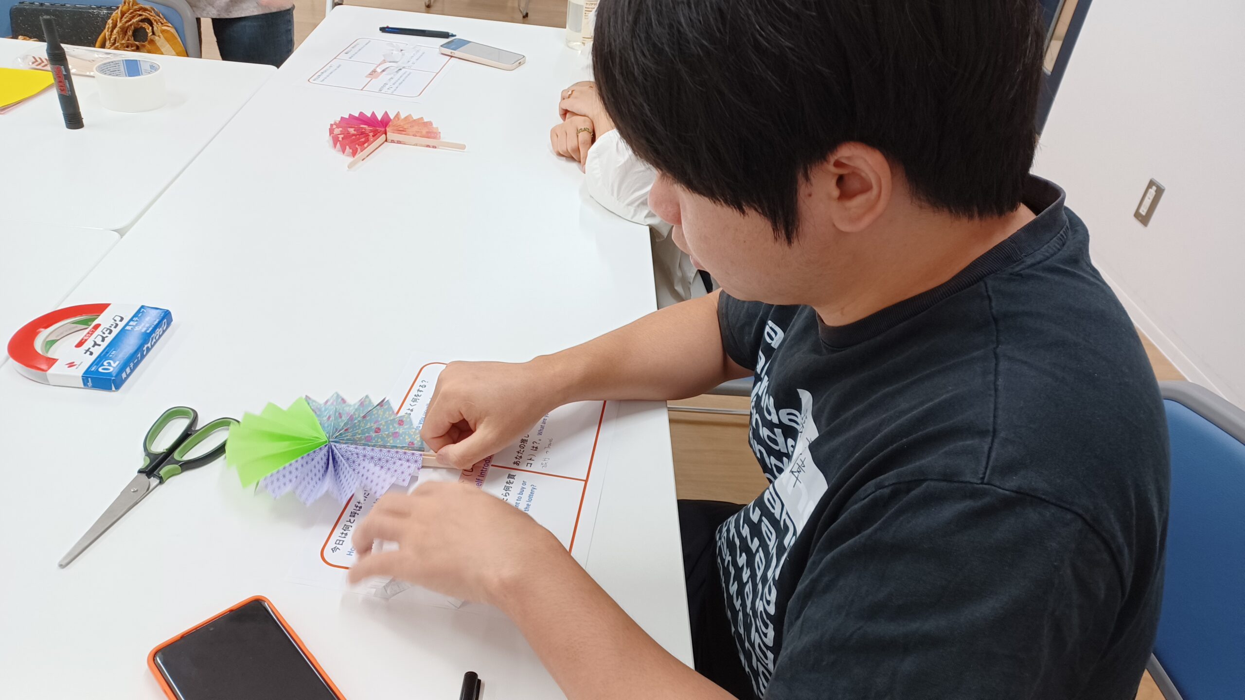 おりがみを使ったり、絵を描いたりしながら、自分だけのオリジナルうちわを作りました。