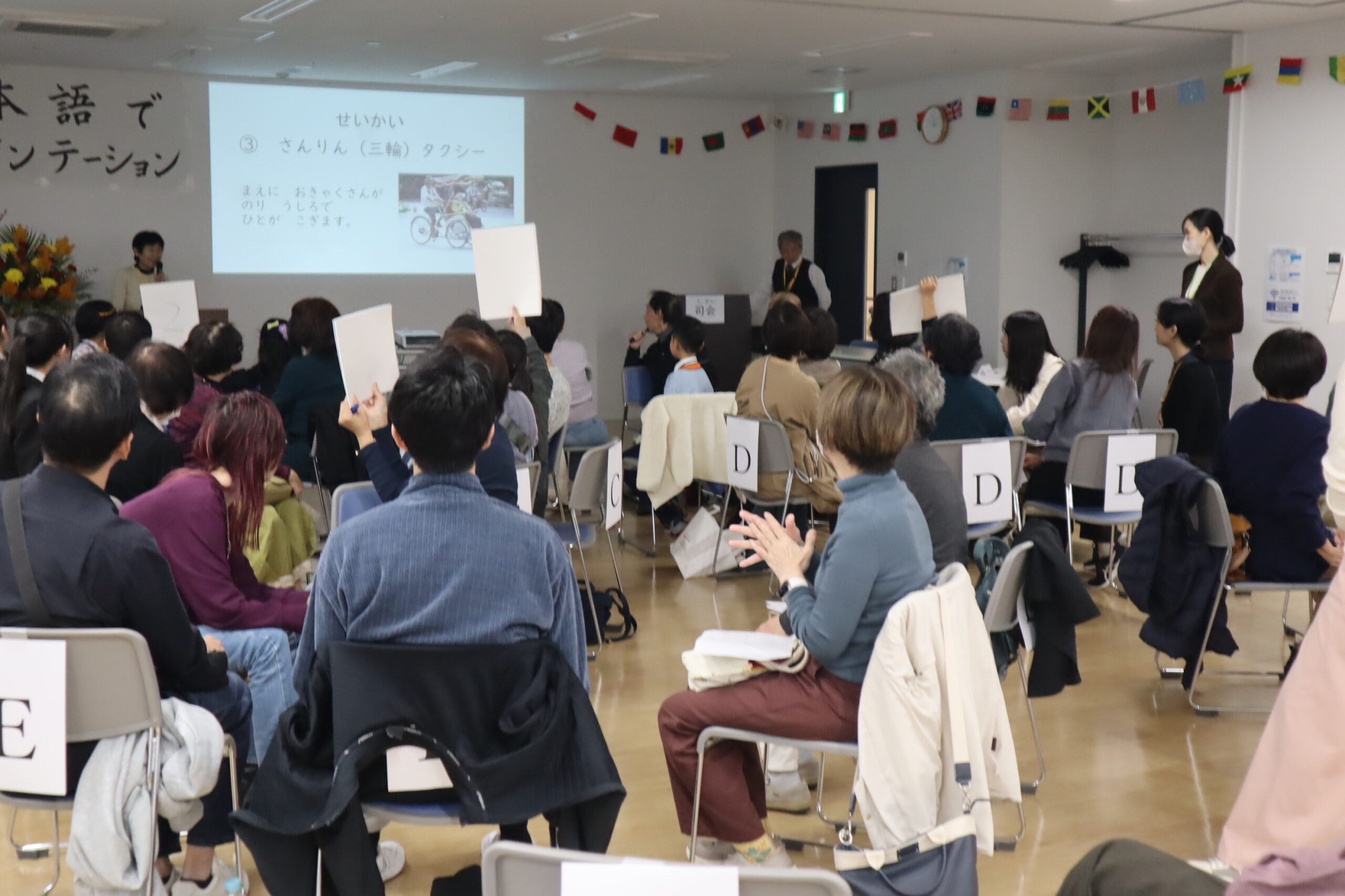 「日本語でプレゼンテーション」を開催しました。今年は、7名の方々が日本語で自身の経験や思いを発表しました。観覧者からは「全ての発表者の方々、とても素晴らしい内容でした」「子どもたちがみんな楽しそうで夢があって良かった」「外国の方の考え方、視点を通じて、新たな日本を知ることができた」との声がありました。発表の後は、会場のみんなで、ゲーム(クイズ・じゃんけん大会)をして盛り上がりました。