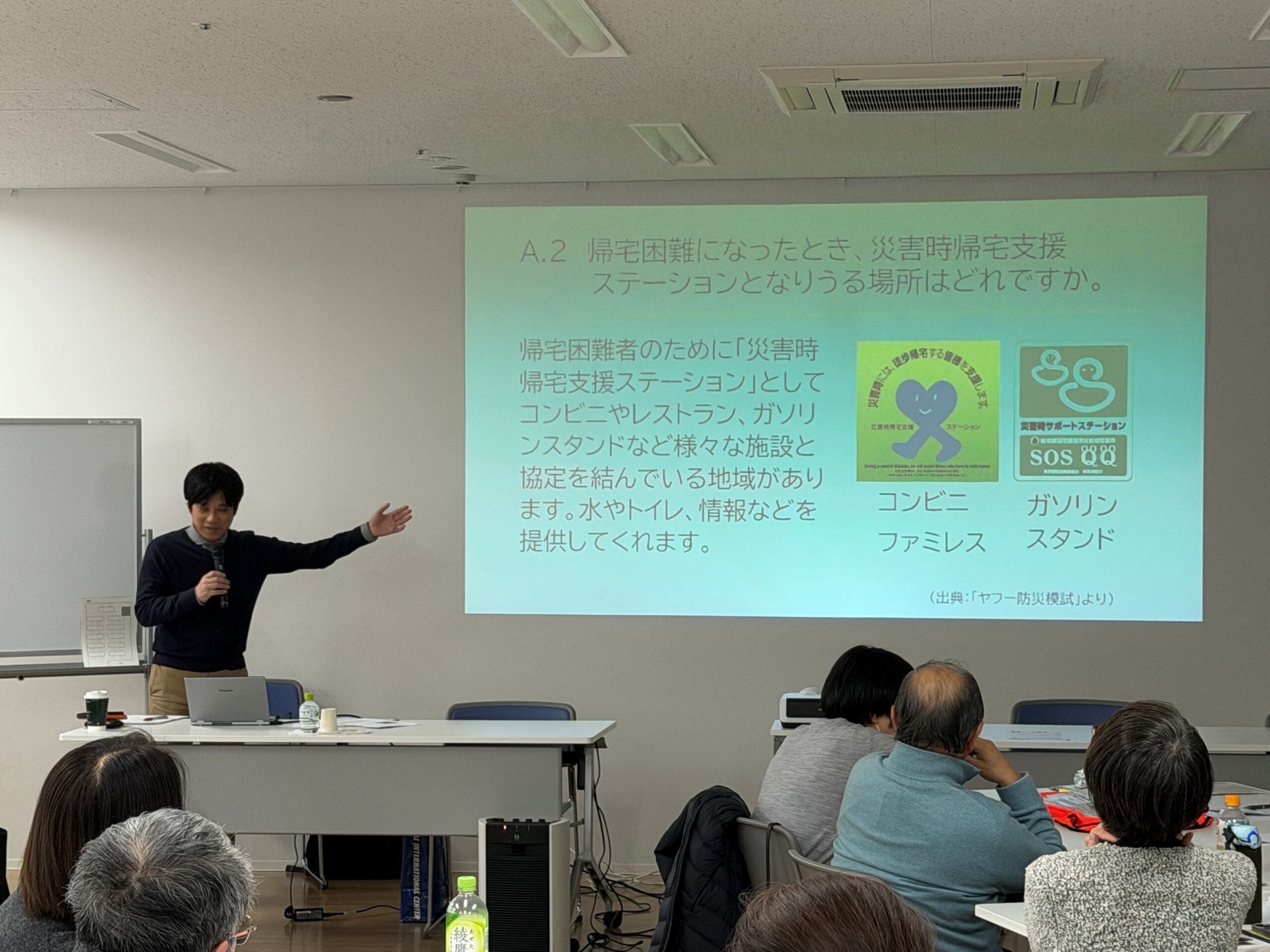 災害時外国人支援ボランティアを対象とし、通訳や外国人区民等からの相談への対応など実際の活動のイメージをつかむことを目的とした講習会を開催しました。参加者は、災害時外国人支援における心構え学んだ後、外国人の国際交流ボランティアが被災者役となった聞き取り訓練を行いました。その後、応急救護の訓練を行いました。参加者は実際に身体を動かす訓練を通じた様々な気づきを活発に共有していました。
